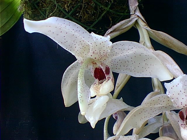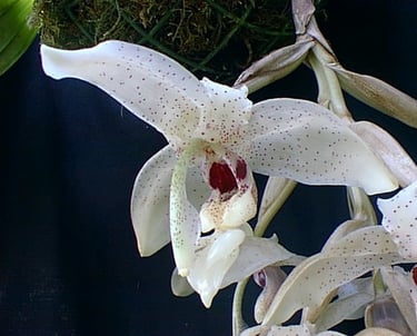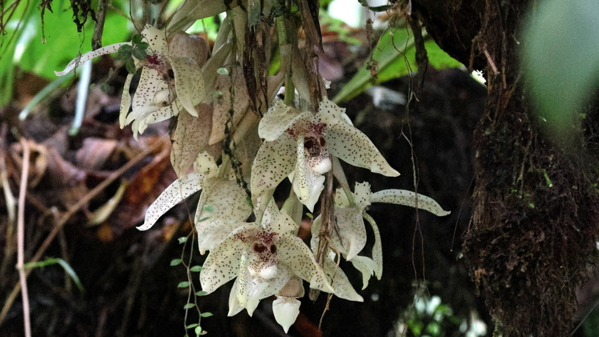 tanhopea florida es una orquídea de crecimiento vigoroso y floración espectacular. Forma pseudobulbos compactos y hojas anchas, mientras que sus flores aparecen colgando hacia abajo, alcanzando entre 15 y 25 cm de tamaño. Su estructura es compleja, casi escultórica, y su aroma es fuerte y dulce, capaz de perfumar todo un espacio cerrado. Requiere humedad alta (75–90%), temperaturas templadas a cálidas entre 22 y 28 °C, buena ventilación y luz abundante pero siempre filtrada. Dentro del domo funciona mejor en cestas o estructuras elevadas, donde sus varas puedan desarrollarse libremente hacia abajo.