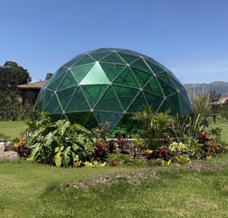 El Domo es una estructura de vidrio de 8 metros de diámetro y 5 metros de altura que recrea un microclima cálido y húmedo para albergar especies tropicales. Su diseño permite regular luz, temperatura y ventilación, creando un espacio controlado donde plantas sensibles pueden desarrollarse fuera de su entorno natural. Es un laboratorio vivo para educación ambiental, investigación y conservación.