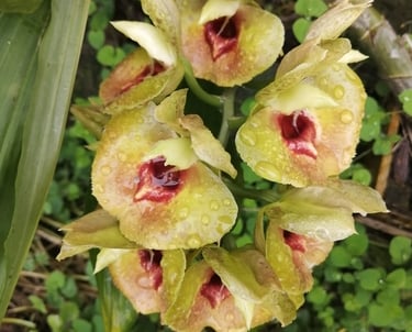 El Catasetum expansum es una orquídea de carácter potente y crecimiento rápido. Sus pseudobulbos son grandes, carnosos y bien definidos. En climas cálidos (22–32 °C), con humedad alta y buena iluminación, florece con fuerza produciendo flores de formas dramáticas. Durante su reposo puede perder completamente las hojas, lo que la convierte en una planta de transformación constante dentro del domo.