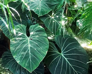 A diferencia de la mayoría de los filodendros, este avanza horizontalmente sobre el suelo en lugar de trepar. Sus hojas acorazonadas pueden medir entre 70 y 90 cm, con nervaduras claras muy marcadas. Prefiere humedad alta, temperaturas entre 20 y 27 °C y sustratos constantemente húmedos pero bien drenados. Es una de las piezas más fotogénicas del domo.